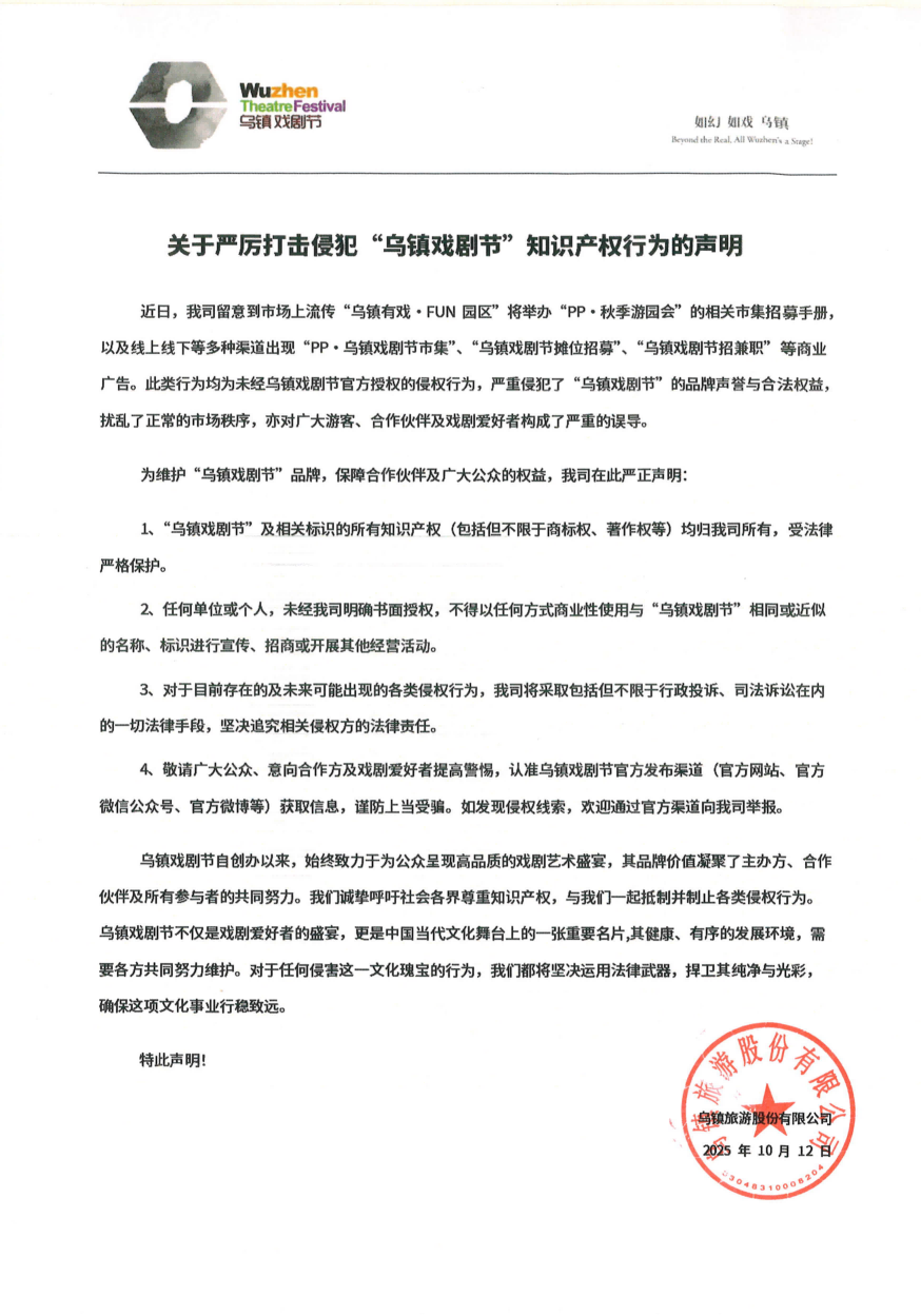 關于(yu)嚴厲打擊侵犯“烏鎮戲劇節(jie)”知識産(chan)權行爲(wei)的(de)聲明