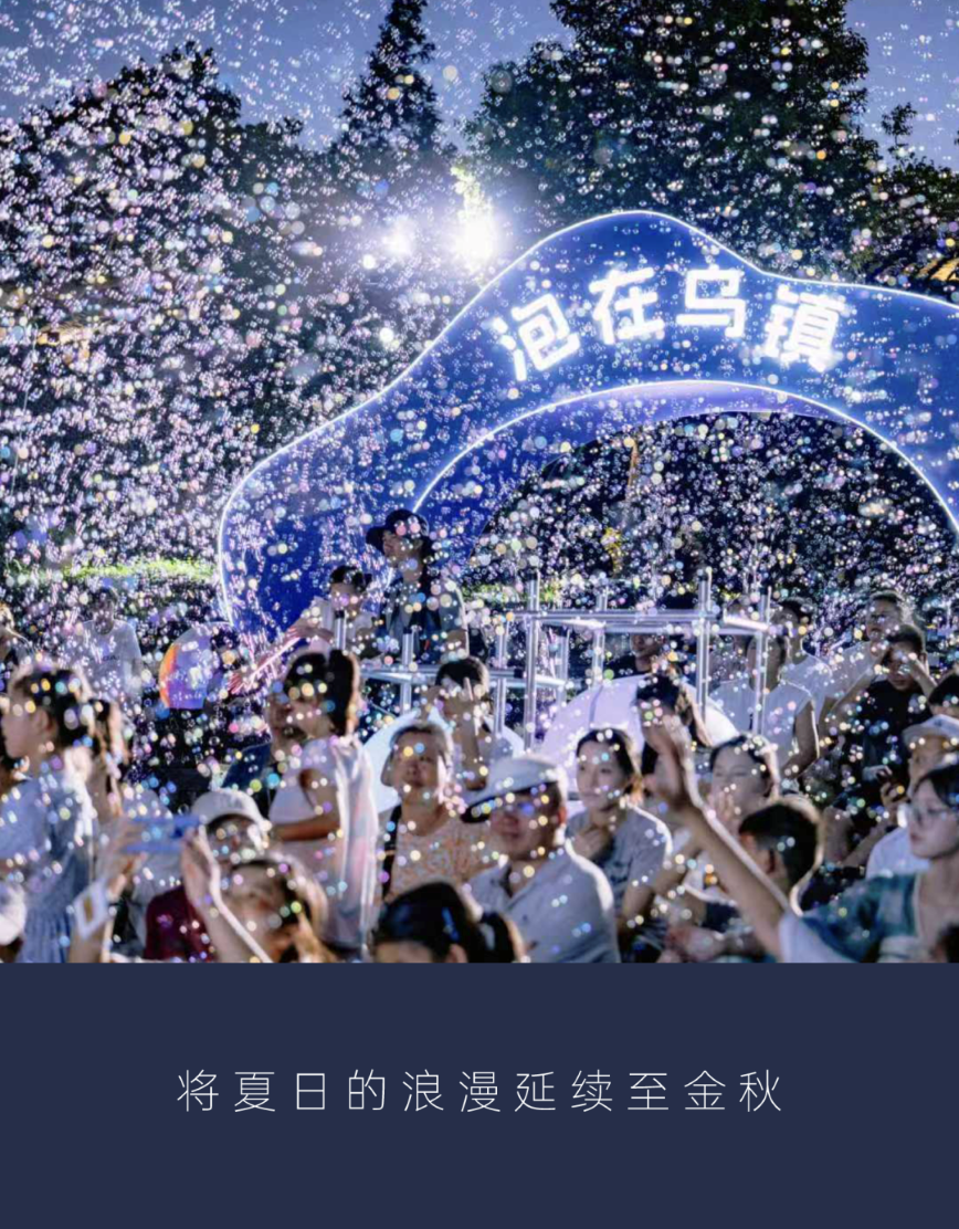 假如,有(yǒu)一(yi)場(chang)夢幻的(de)夜遊盛(sheng)宴,你會赴約嗎? 在(zai)這裏,你可(kě)以(yi)讓雙腳輕觸清(qing)涼的(de)流水 你可(kě)以(yi)仰望漫天飛舞的(de)泡泡奇境 你可(kě)以(yi)聆聽最潮(chao)音樂現(xian)場(chang)的(de)靈(ling)魂共鳴...... 在(zai)這裏,你要抛開拘束,抛開矜持 瘋玩整夜,找回那箇(ge)愛做夢的(de)自己 烏鎮水劇場(chang)泡泡夜遊神活動(dòng)延長(zhang)至十月 這箇(ge)金秋,我(wo)們共赴浪漫之(zhi)約