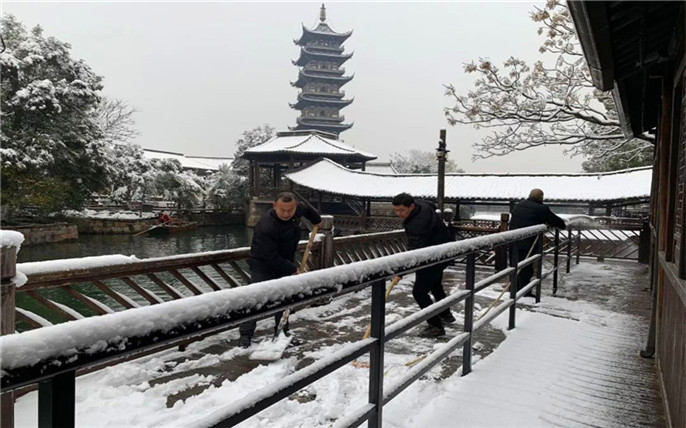 爲(wei)保障遊客安(an)全遊覽,避免因積雪(xuě)路面較滑導(dao)緻遊客受傷等(deng)安(an)全事件的(de)髮(fa)生(sheng),公(gōng)司員(yuan)工(gong)第一(yi)時間自髮(fa)地進(jin)行了(le)積雪(xuě)清(qing)理(li)。