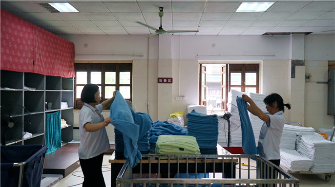 國(guo)慶黃金周進(jin)入第四天,客流量咊(he)入住率均在(zai)不斷(duan)攀升。爲(wei)了(le)讓每一(yi)位入住客人(ren)都能(néng)使用(yong)清(qing)爽潔淨的(de)被褥,讓一(yi)位用(yong)餐的(de)客人(ren)都能(néng)感受到(dao)整潔,洗衣房這支平均年(nian)紀45歲,平均工(gong)齡8年(nian)的(de)幕後(hou)隊(duì)伍加(jia)班加(jia)點完成(cheng)每天2萬多(duo)件被褥、檯(tai)布的(de)清(qing)洗工(gong)作(zuò)。